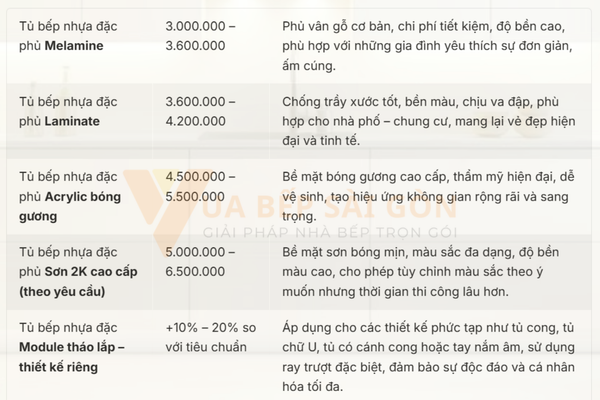 - Chất lượng sản phẩm: Vua Bếp Sài Gòn sử dụng nhựa cao cấp và công nghệ tiên tiến để sản xuất tủ bếp, đảm bảo độ bền cao, chịu được va đập, chống ẩm mốc và dễ dàng vệ sinh.